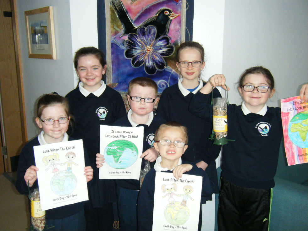 Well done to Luke P1, Ava P2, Ellie Rose P3 and Des P4 who won the Earth Day colouring competition organised by the Eco-Committee. Pictured are Ava and Cliodhna presenting the awards.